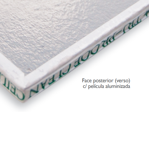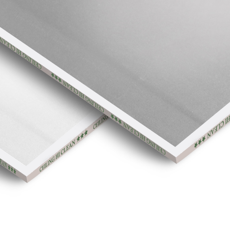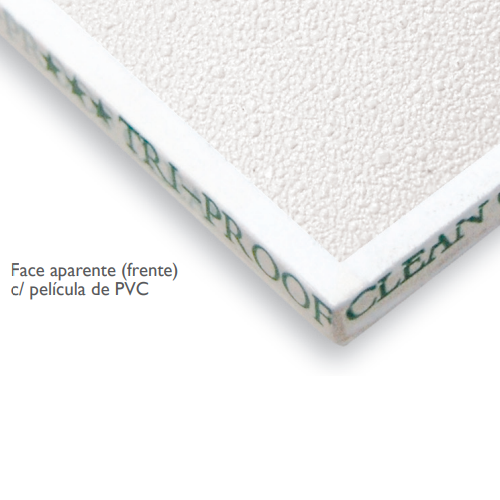 O Forro Hi-Clean proporciona o melhor acabamento e facilidade de limpeza. Ele é formado por placa de gesso entre duas lâminas de cartão, revestida com uma película de PVC em sua face aparente e com uma fita protetora em suas bordas laterais. Além disso, sua face posterior possui aplicação de uma película refletora aluminizada que atua com isolamento térmico, refletindo o calor existente no plenum. Por apresentar características de impermeabilidade, a película aluminizada também protege as placas de goteiras, respingos, umidade, sujeira e proliferação de fungos, garantindo ambientes internos muito mais higiênicos, agradáveis e confortáveis.